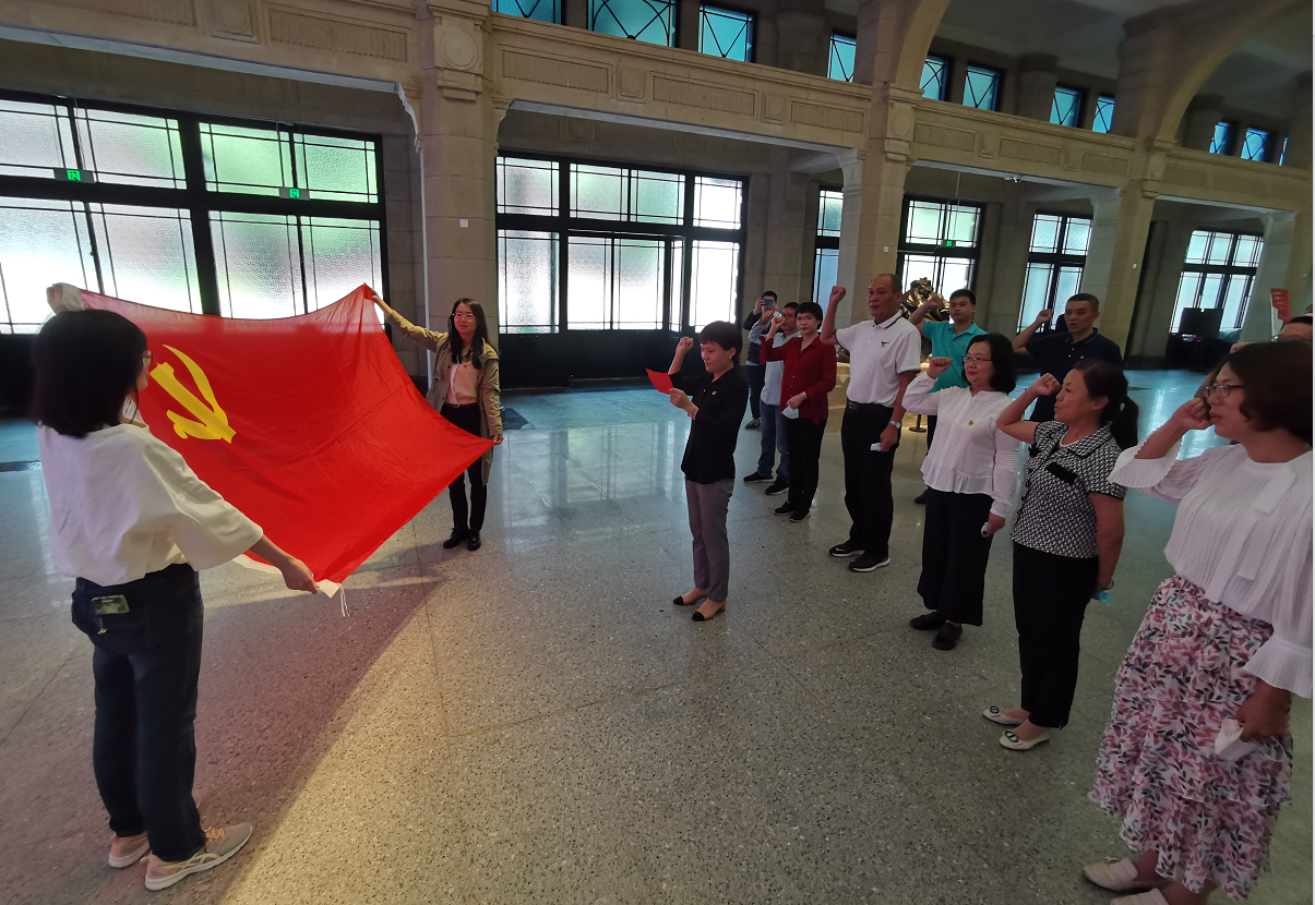 在上海市历史博物馆宣誓厅,同志们举起右拳庄严宣誓,重温入党誓词,铿锵有力的宣誓声响彻大厅。