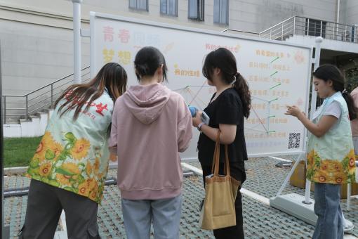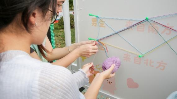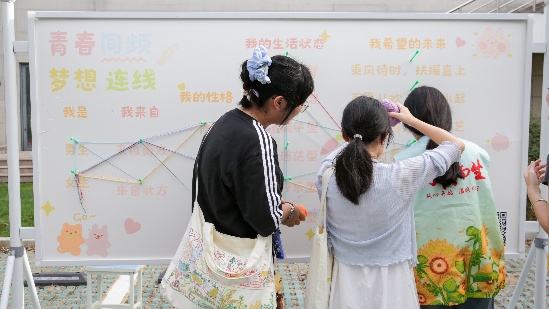 “青春同频,梦想连线”环节的梦想墙前格外热闹。同学们拿起各色毛线,将众多板块中属于自己的选项一一连接:来自四川的同学,连线希望每周都有火锅局;喜欢安静阅读的同学,将丝线牵向“期待泡在图书馆的日子”。当彩色毛线在展板上交织成网,大家不仅可以清晰看见自己的校园期待,更能够轻松找到有着相同属性、相似梦想的伙伴。在这一刻,同学们对“心”校园的归属感渐渐萌生!