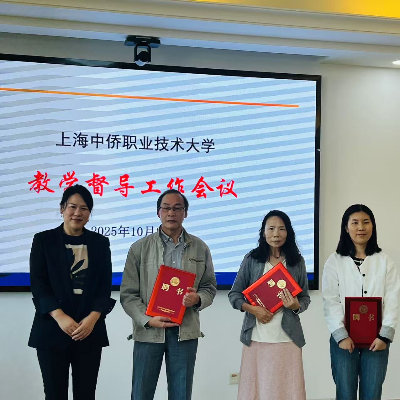 会议公布新一批校级教学督导聘任名单,王铭欣、刘继荣、陈斌、刘祥凯四位教师受聘为校级兼职教学督导。戴红梅对他们的加入表示热烈欢迎,并为新任督导教师颁发聘书。