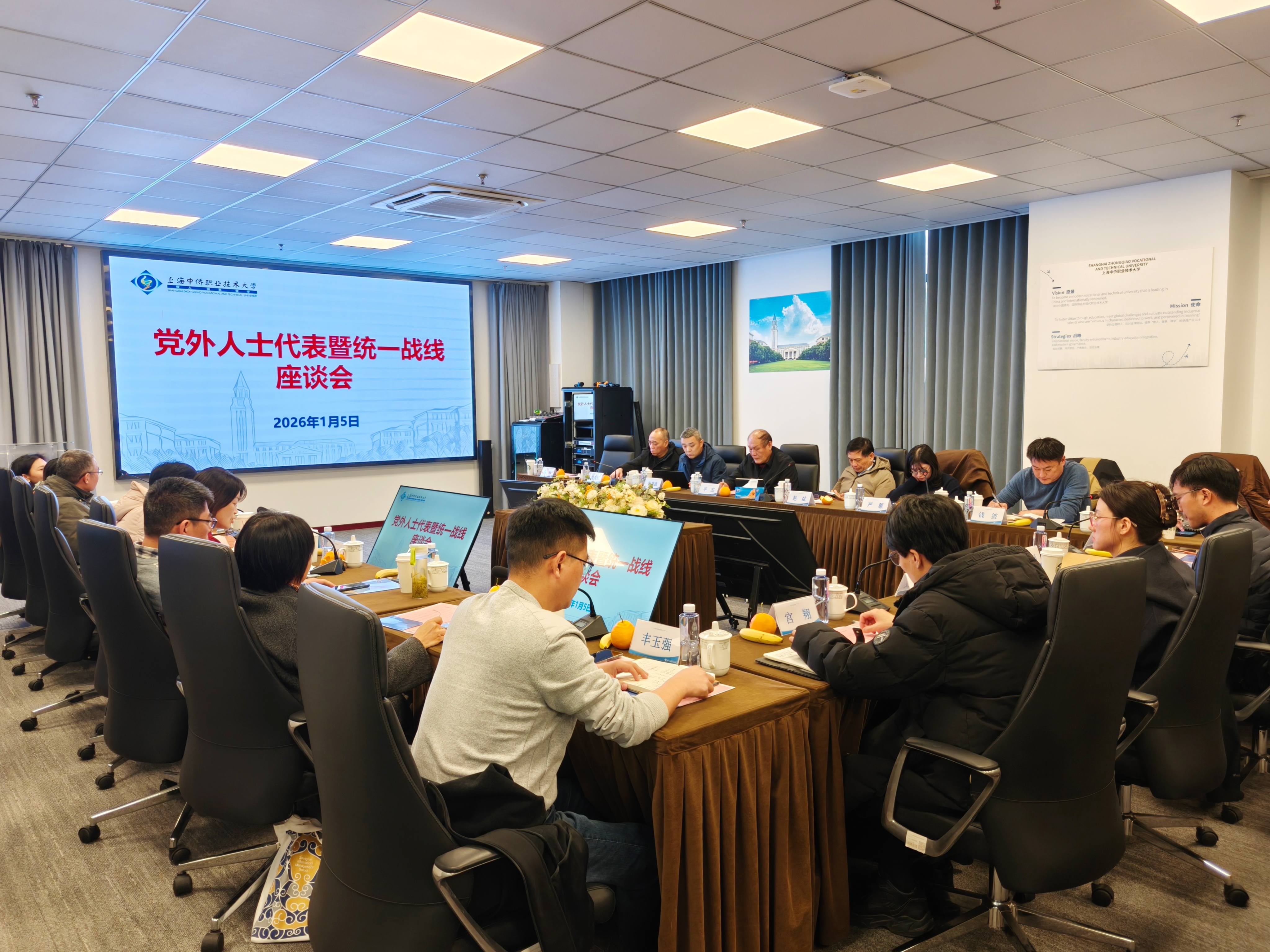 为深入学习贯彻习近平总书记关于做好新时代党的统一战线工作的重要思想,全面落实党的二十届四中全会精神,广泛汇聚全校统一战线智慧与力量,共同谋划学校高质量发展与“十五五”事业发展规划,1月5日,上海中侨职业技术大学召开党外代表人士暨统一战线座谈会。中侨大学党委书记平杰,党委副书记朱范鑫,党委各职能部门负责人,各民主党派基层组织负责人、无党派人士代表、留学归国人员代表等出席会议。会议由党委统战部部长钱波主持。