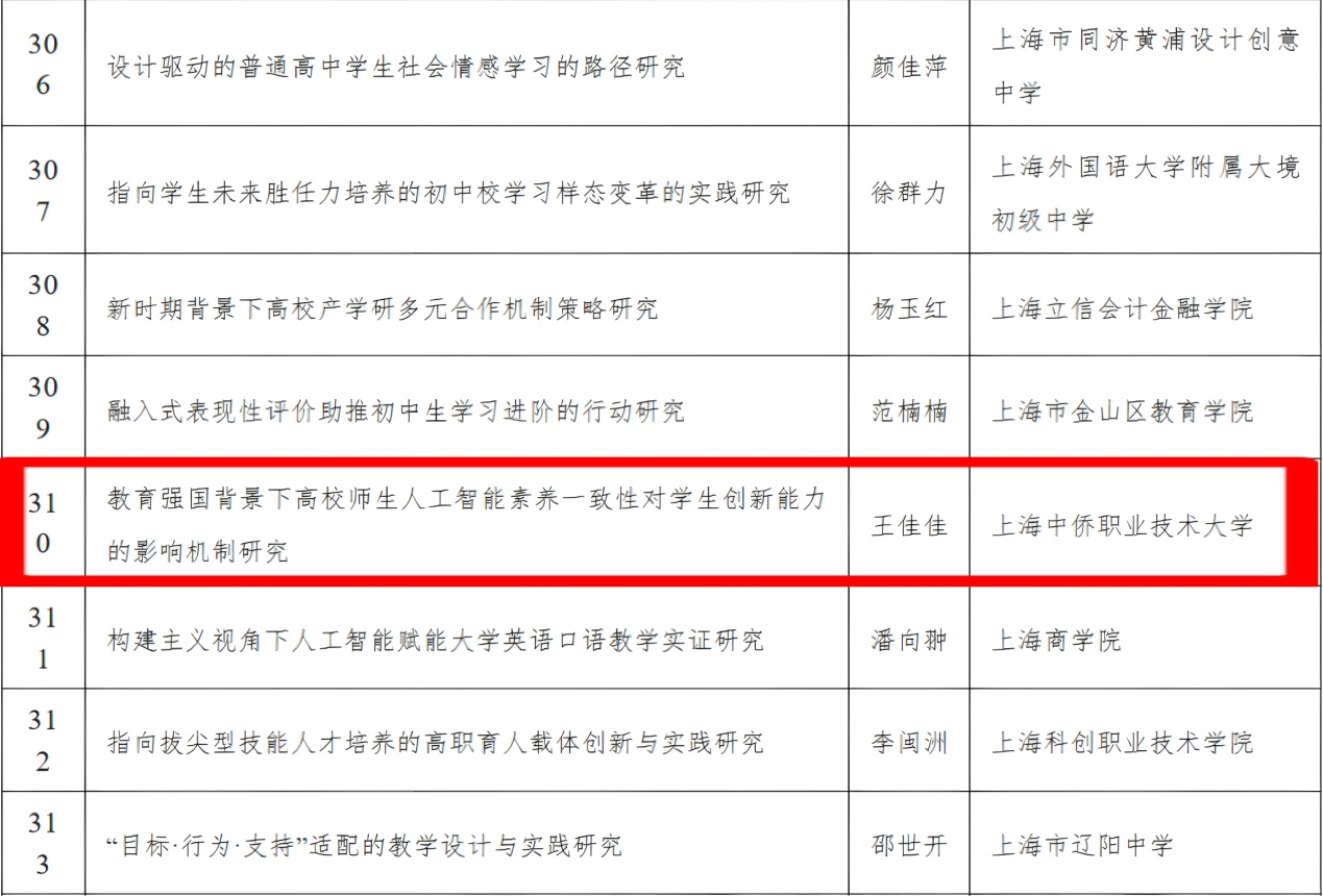 上海市教育委员会公示《2026年度上海市教育科学研究项目拟立项名单》,我校王佳佳老师的《教育强国背景下高校师生人工智能素养一致性对学生创新能力的影响机制研究》成功入选市级一般项目。本项目以赋能教育理论创新、深化教育实践探索为核心目标。我校教师的成功入选,既是学校在教育科研领域深厚积淀的有力彰显,更充分印证了我校在该领域的强劲发展潜力。