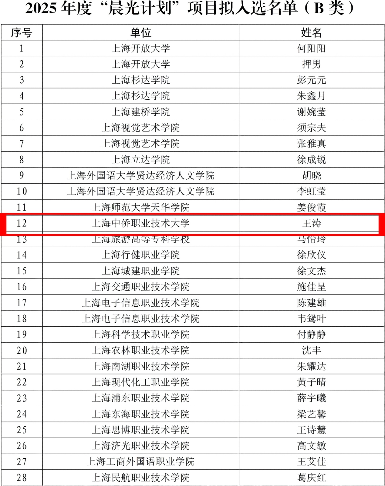 根据上海市教育委员会、上海市教育发展基金会联合组织的2025年度“晨光计划”项目申报工作结果公示,王涛老师成功入选B类项目,“晨光计划” 是上海市扶持青年教师科研成长的关键平台。此次成功入选,既是对青年教师个人科研潜力的莫大肯定,也生动彰显了我校在青年师资队伍建设、科研人才梯队培育工作中取得的显著成效。