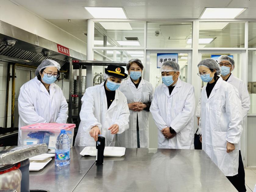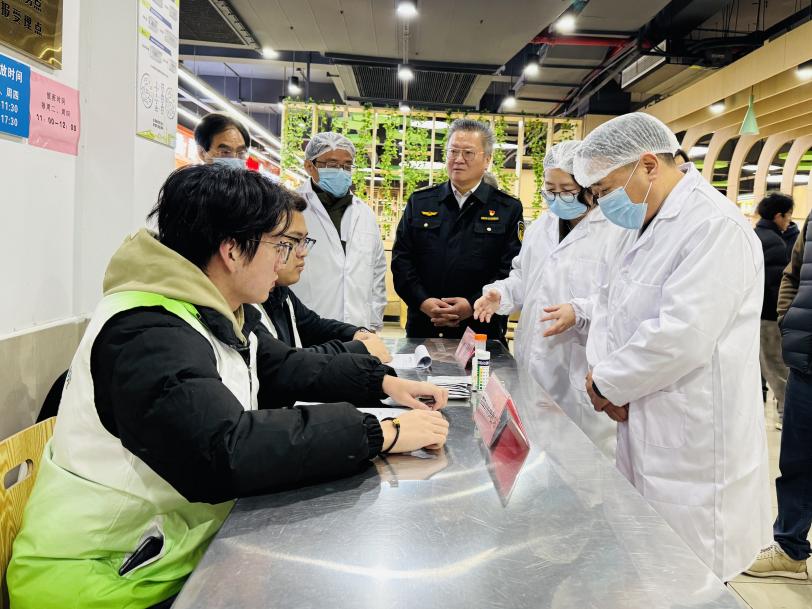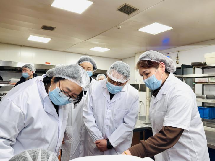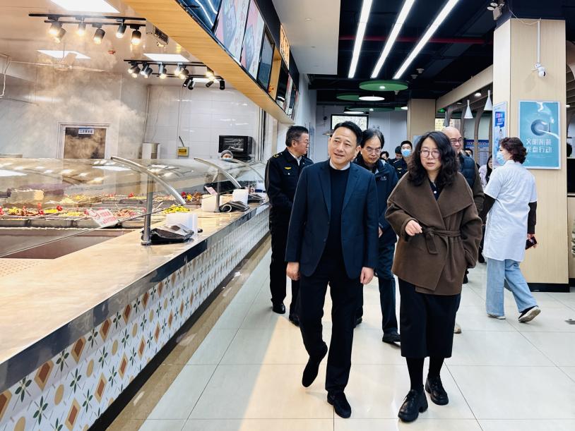 潘恩华一行实地查看就餐区域与后厨操作间,重点检查从业人员健康证公示、食品安全制度上墙、每日晨检记录等情况,认真核查食品采购、卫生安全、规范操作等重要环节。围绕食堂日常运行管理、食品安全制度执行、食材采购验收等重点环节作了详细介绍。