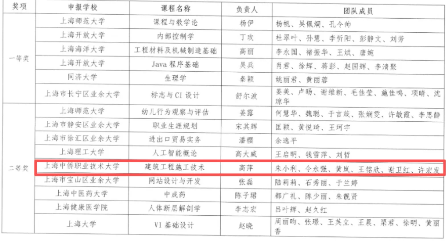 近日,上海市教育评估协会公布了《2025年上海市高等学历继续教育“课程思政”优秀项目评选结果》。上海中侨职业技术大学建筑工程学院申报的建筑工程施工技术课程,经过层层选拔,成功斩获二等奖。