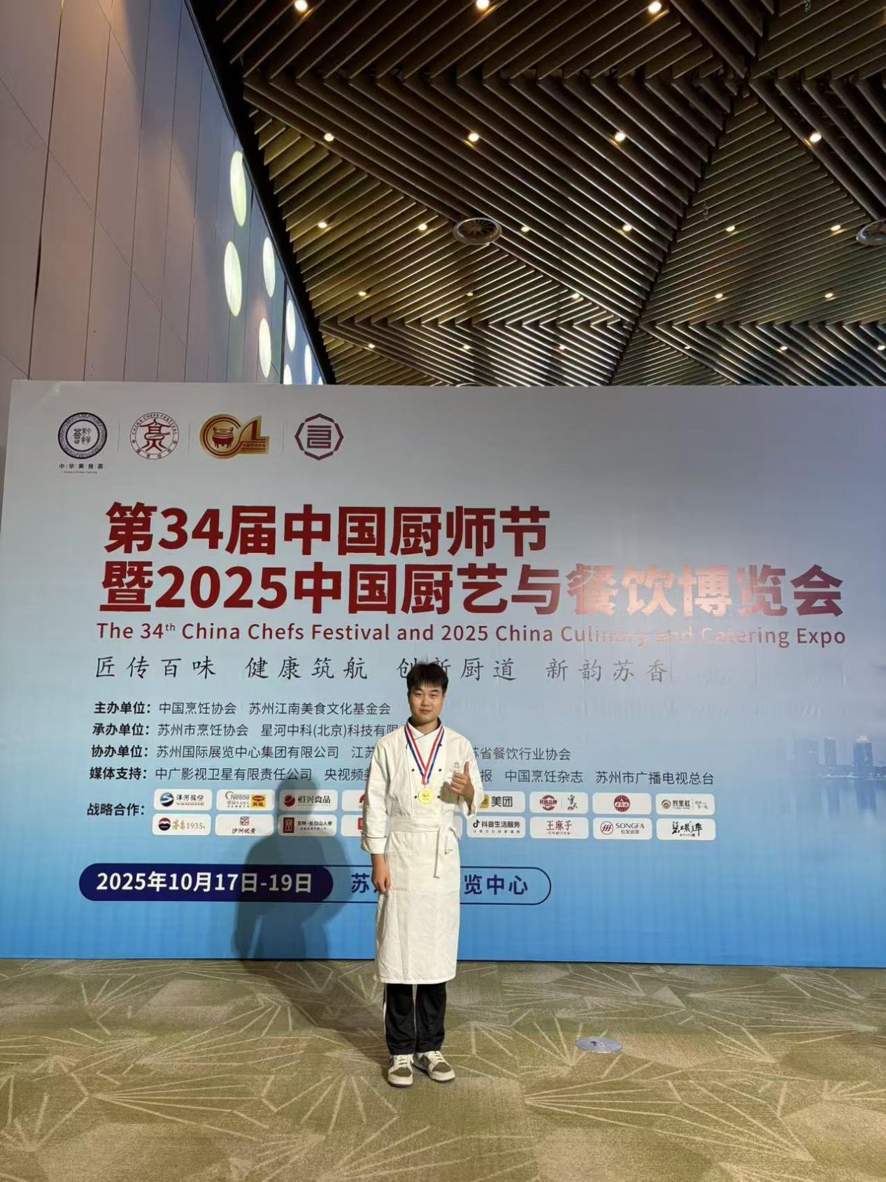 近日,从苏州国际博览中心传来喜讯,在刚刚落幕的2025西餐烹饪技能大赛中,我校烹饪与酒店管理学院王博涵老师凭借扎实的专业功底与卓越的烘焙技艺,从众多参赛高手中脱颖而出,荣获烘焙项目金奖,为学校再添一项重要荣誉。2025西餐烹饪技能大赛由中国烹饪协会主办,苏州江南美食文化基金会联合主办,并获世界厨师联合会(WACS)官方认证。作为第34届中国厨师节的重要配套赛事,本届大赛以“匠传百味,健康筑航,创新厨道,新韵苏香”为主题,汇聚全国西餐行业顶尖选手,是我国西餐烹饪领域展示技艺、交流创新成果的重要平台。王博涵老师的参赛作品在传统工艺基础上融入创新表达与健康理念。其制作的法棍沿用原始基础工艺,健康面包中融入谷物与青稞粉,造型精致、麦香浓郁;经典牛角包延伸出双色与弯月两款,层次分明、风味地道。花式可颂系列更成为赛场视觉焦点,其中双色可颂与迷你巴黎铁塔造型别具匠心,部分作品顶部以齿轮纹路装饰,巧妙呼应“技能强国、科技强国”的时代主题。两款布里欧修则在味觉上实现突破,柔润面团包裹树莓奶酪内馅,口感层次丰富,充分展现了我校教师在烘焙工艺与创意表达上的综合实力。赛事期间,享有国务院特殊津贴专家、淮扬菜非