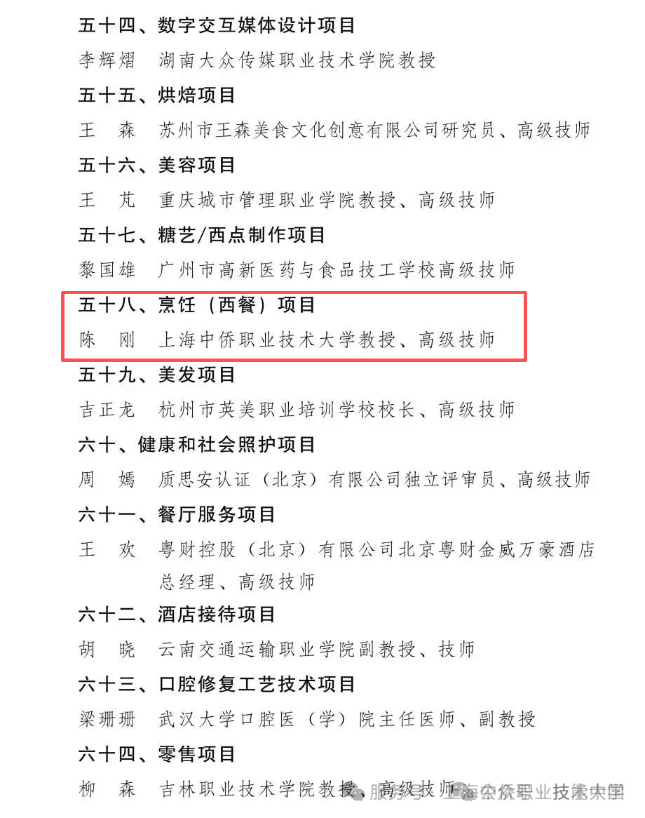 根据《世界技能大赛参赛管理暂行办法》,经第48届世界技能大赛中国组委会研究,日前确定64名同志为第48届世界技能大赛中国技术指导专家组组长(以下简称专家组组长)。上海中侨职业技术大学烹饪与酒店管理学院陈刚教授任第48届世界技能大赛烹饪(西餐)项目专家组组长。
