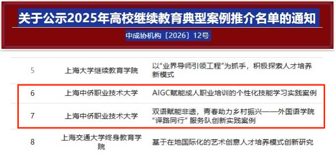 近日,中国成人教育协会正式公示了2025年高校继续教育典型案例推介名单。上海中侨职业技术大学报送的两项案例——《AIGC赋能成人职业培训的个性化技能学习实践案例》与《双语赋能非遗,青春助力乡村振兴——外国语学院“译路同行”服务队创新实践案例》从全国众多参评项目中脱颖而出,双双入选年度典型案例,跻身全国仅75个席位之列,充分展现了学校在服务全民终身学习、推动教育数字化转型及文化传承创新方面的强劲实力与广泛影响力。两项案例分别由建筑工程学院高萍、黄岚老师团队,以及外国语学院胡海燕、李秀明、潘苹老师团队主导实践。前者聚焦成人职业技能培训的数字化转型,探索人工智能赋能个性化学习的新路径;后者则致力于传统文化的国际化传播,以青春力量助力乡村振兴,集中体现了我校在深化非学历教育改革、服务国家战略需求方面的扎实探索与积极成效。