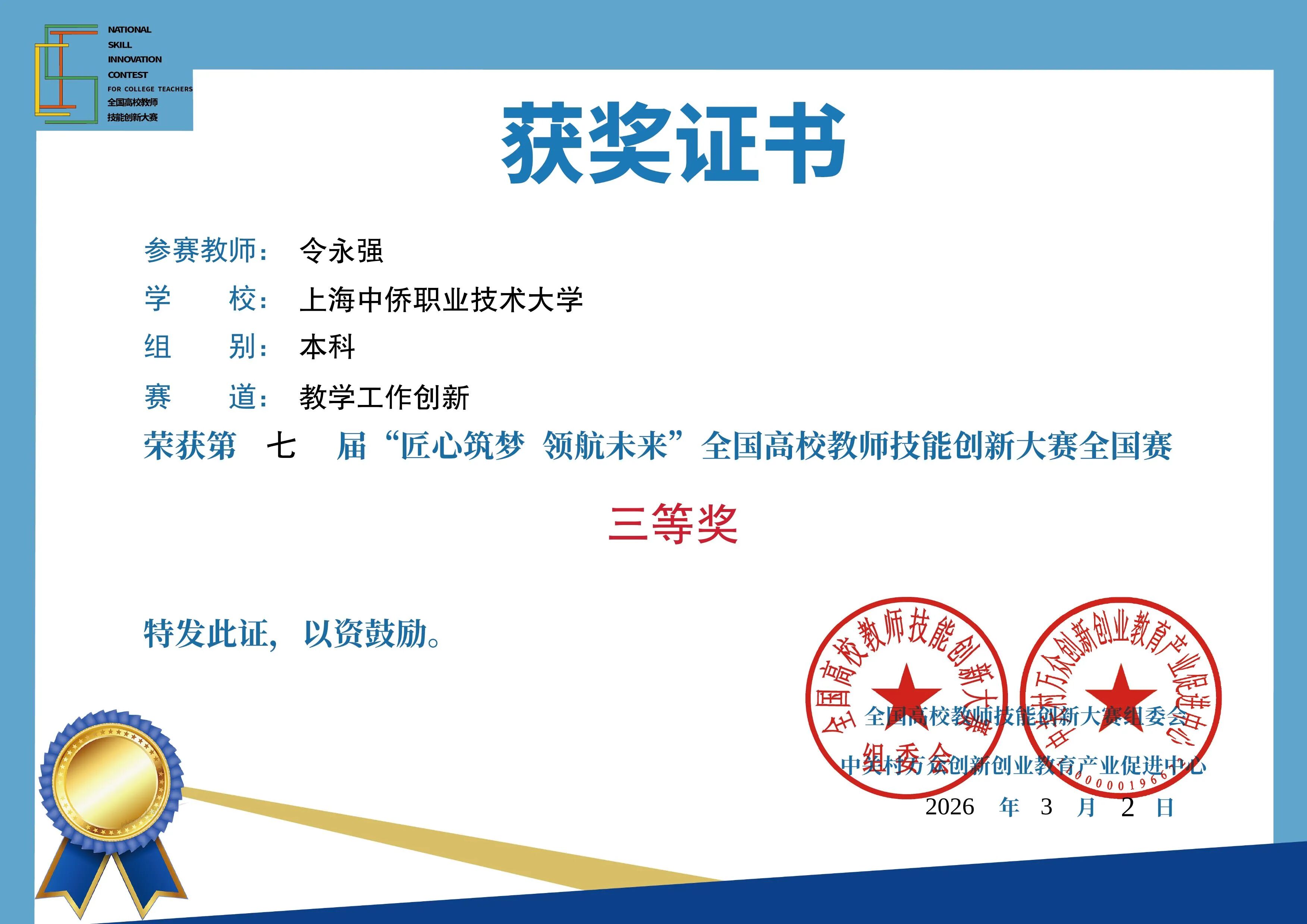 2026年3月2日 —— 第七届“匠心筑梦 领航未来”全国高校教师技能创新大赛全国赛结果揭晓。赫尔辛基未来工程学院教师令永强凭借在“教学工作创新”赛道中的卓越表现,荣获全国赛三等奖。该赛事由全国高校教师技能创新大赛组委会与中关村万众创新创业教育产业促进中心联合主办,是国内高校教师展示教学创新成果的重要平台。